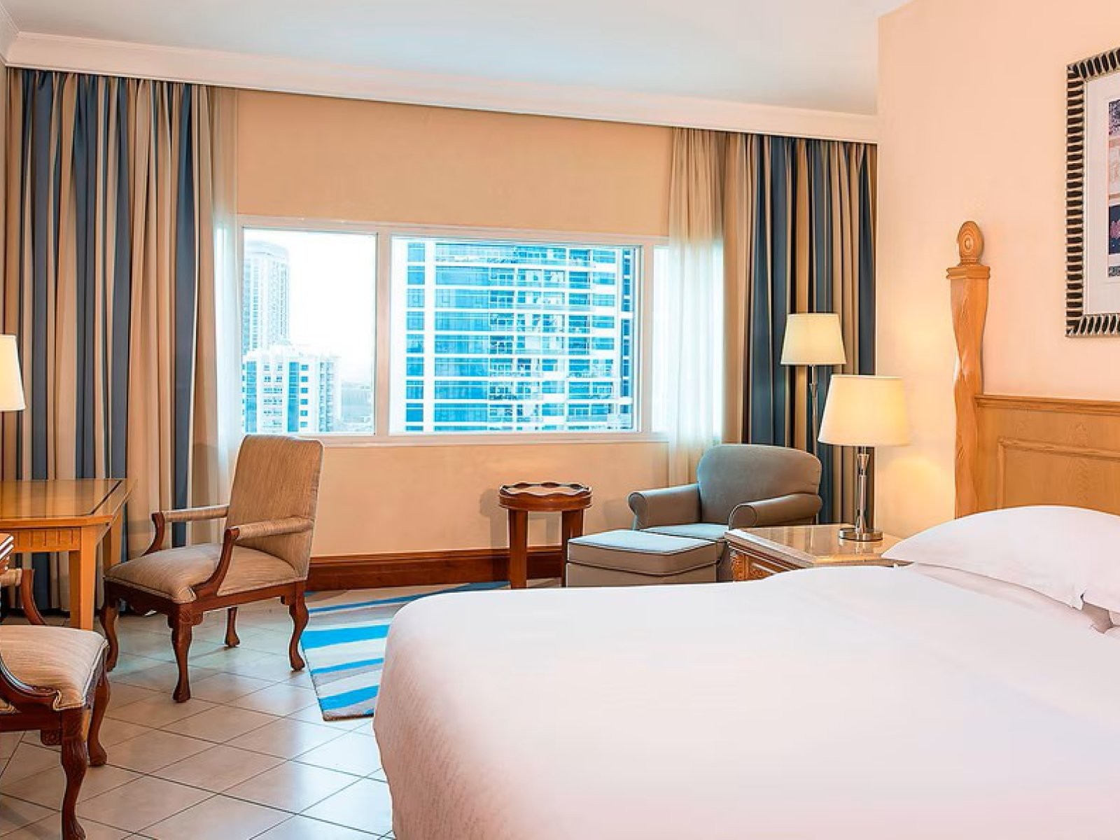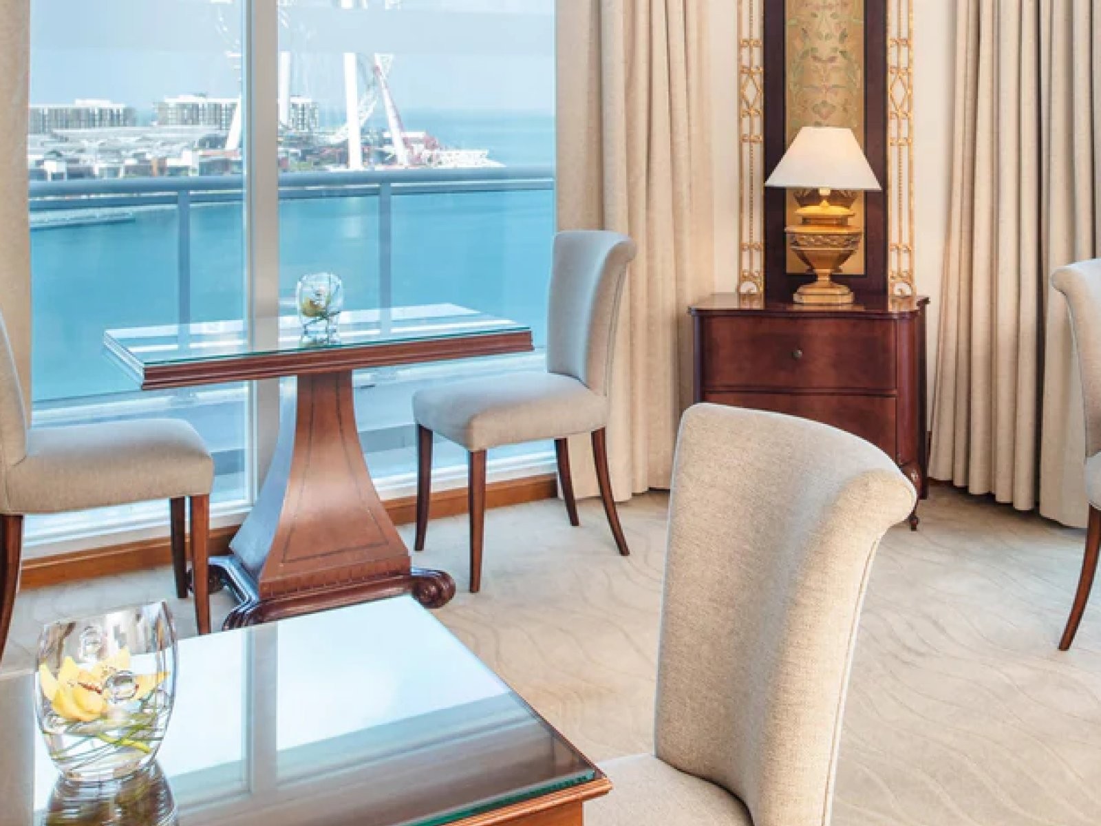 256 camere e suite di varie categorie con aria condizionata, TV satellitare, telefono, minibar, cassetta di sicurezza a pagamento, asciugacapelli. The Peacok con cucina cinese, Al Hadiqa con cucina libanese, Seafield Mediterranean Eatery cucina mediterranea, Bliss Lounge per bevande rinfrescanti, Azur Pool & Bar per pranzo e bevande rinfrescanti, Black Goose Buns & Brews per cene rilassanti. Piscina e attrezzata spiaggia privata, centro fitness, Spa, beach volley, campo da calcio, campi da squash. A pagamento: vari sport d’acqua fra cui immersioni, sci nautico, vela, windsurf, kayak. Sandy Toes Kids Club riservato ai bambini.