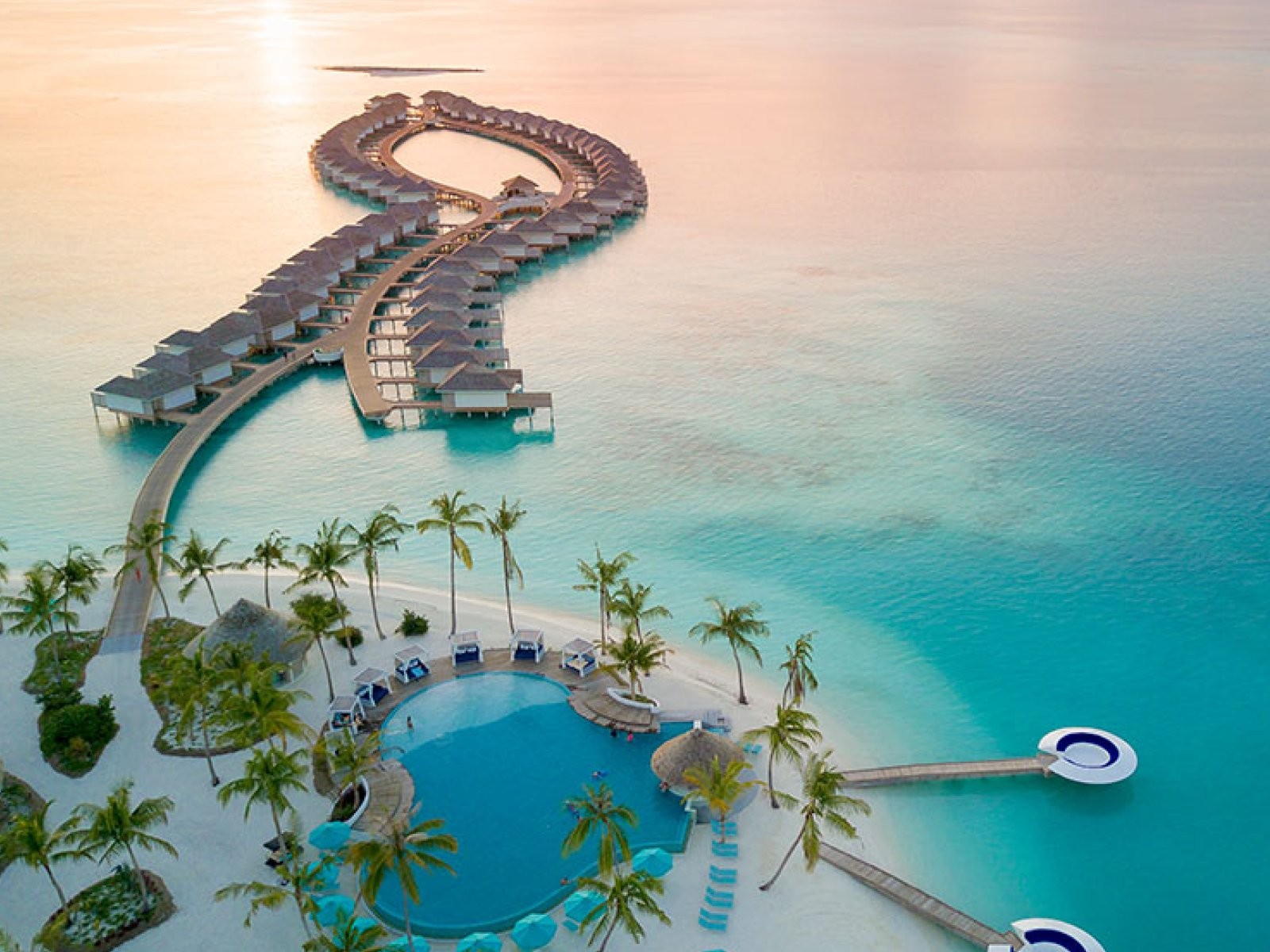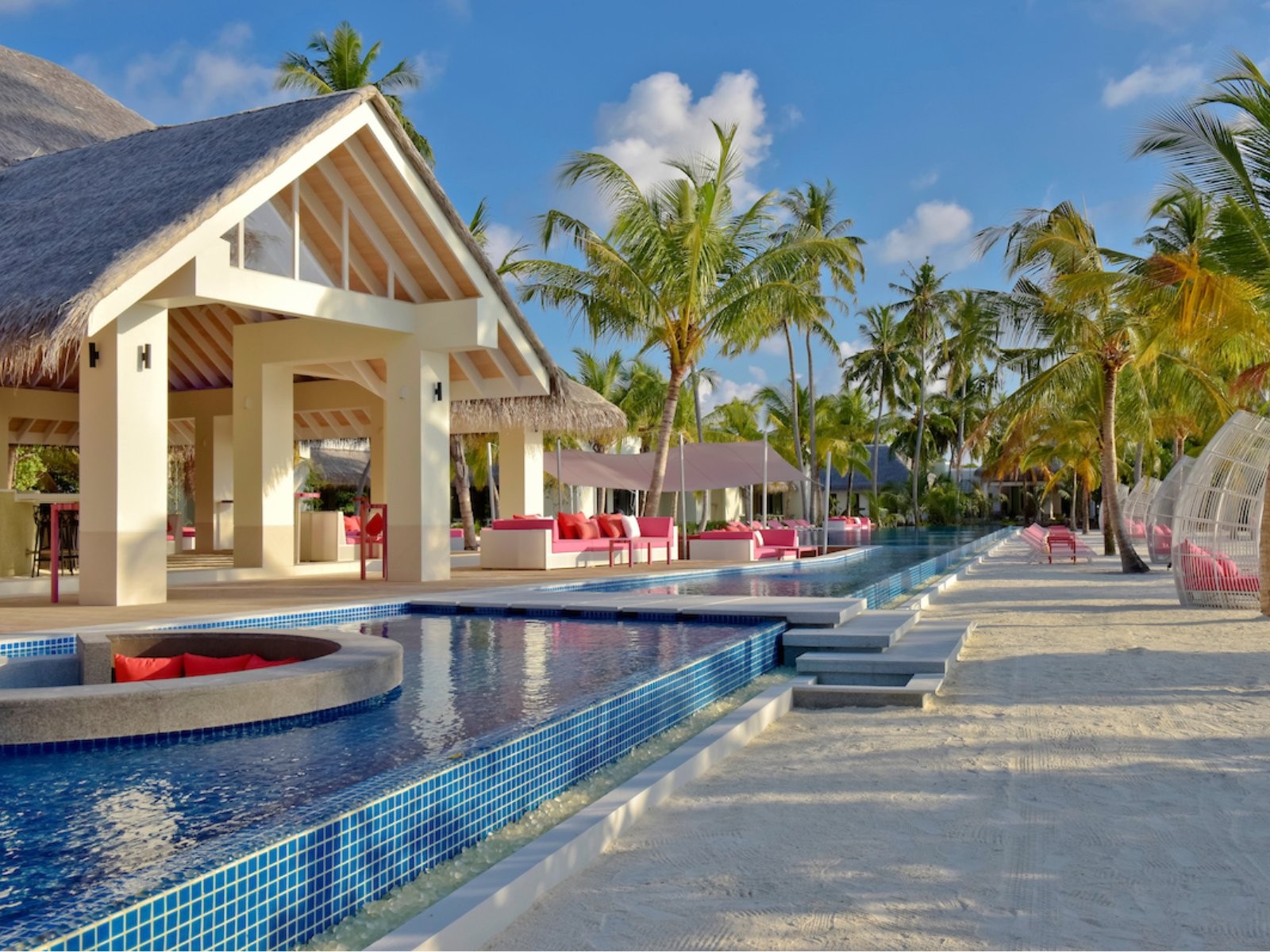 Una lunga spiaggia di sabbia corallina e un’enorme piscina a sfioro e una terrazza privata sull'acqua con lettini prendisole.