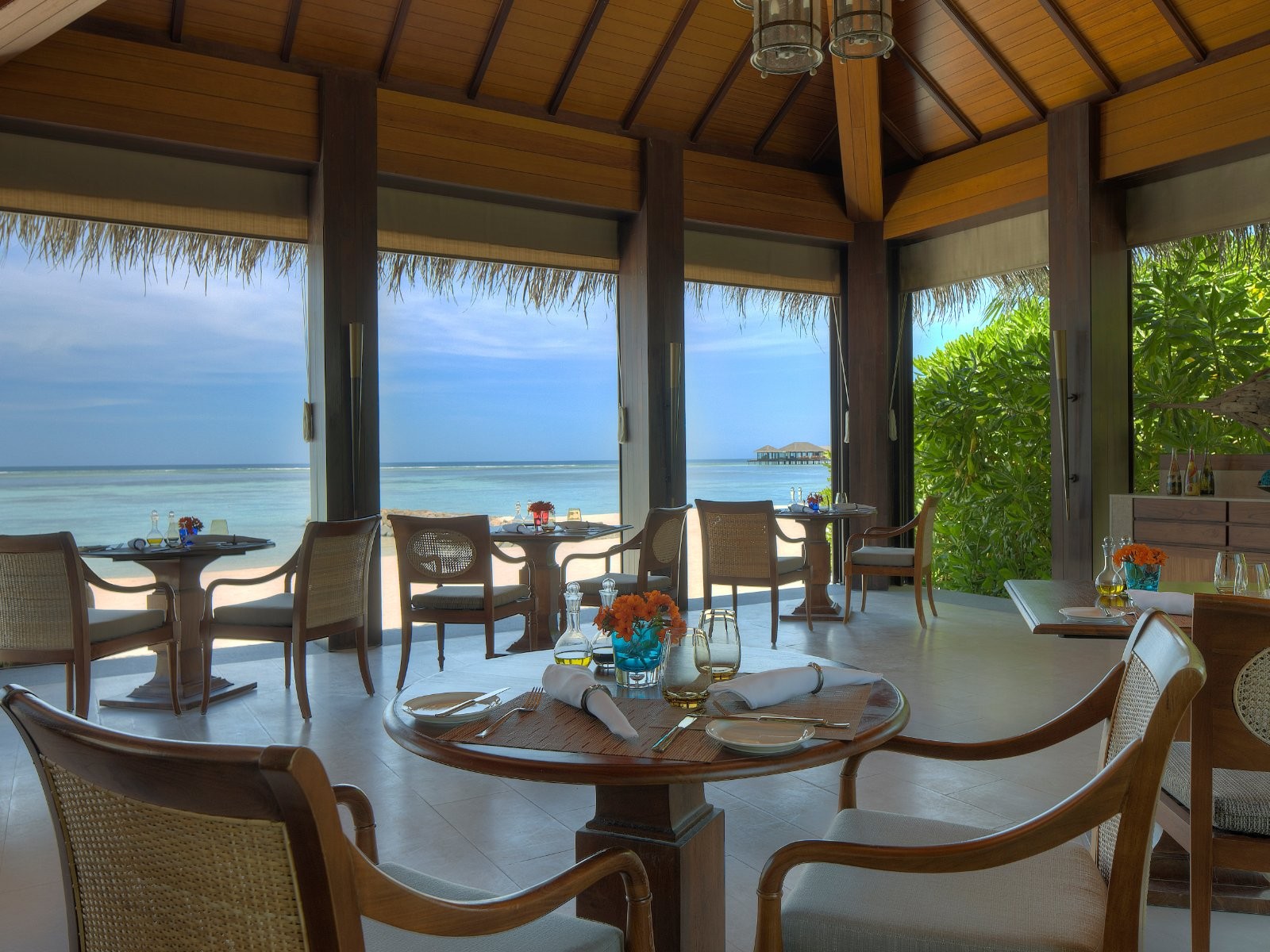 94 ville beach e overwater, con aria condizionata, ventilatore a soffitto, TV satellitare, DVD, telefono, wi-fi, minibar, macchina per il caffè Nespresso, cassetta di sicurezza, asciugacapelli. Disponibili ville con living room, 2 camere da letto e 2 bagni. The Dining Room con cucina internazionale e serate a tema, The Falhumaa situato alla fine del molo sopra la barriera corallina, per una cucina ricercata con piatti gastronomici internazionali, The Beach Bar, con piatti leggeri, cocktail e tapas. Possibilità di pranzare e cenare nella propria villa 24h su 24.