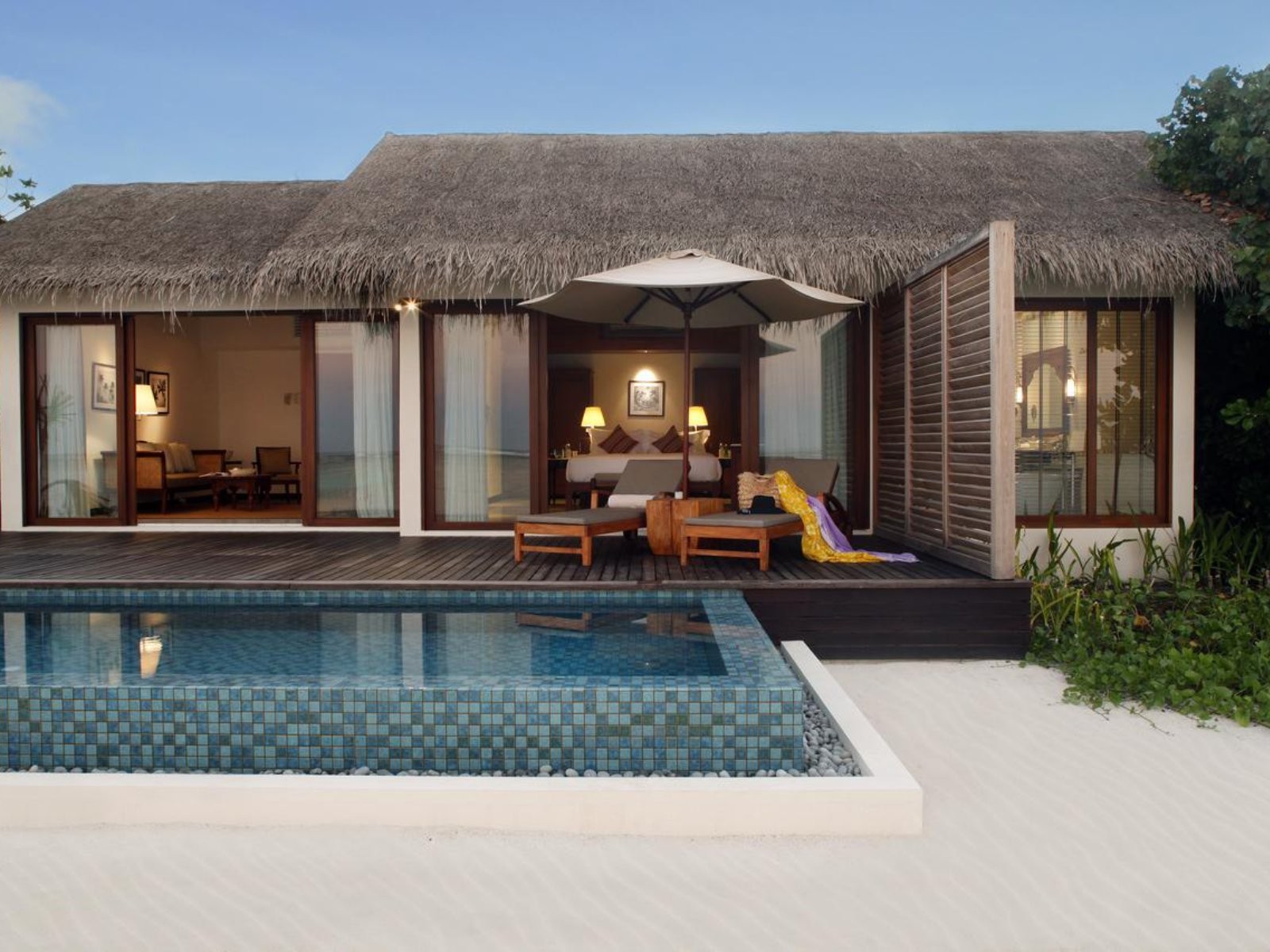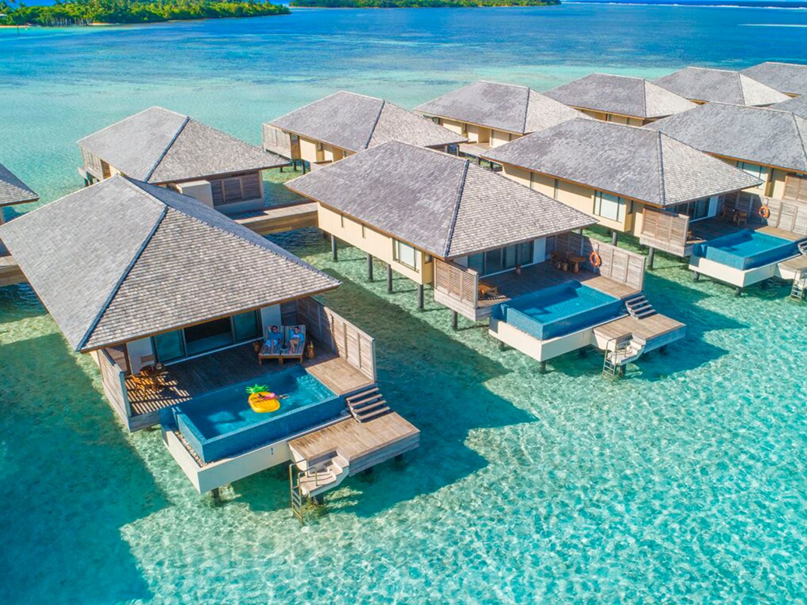 173 ville di categoria beach, lagoon e overwater, tutte con piscina privata, aria condizionata, ventilatore a soffitto, TV satellitare, DVD, telefono, wi-fi, minibar, macchina per il caffè Nespresso, cassetta di sicurezza, asciugacapelli. Disponibili ville con living room, 2 camere da letto e 2 bagni. Butler service a disposizione, su richiesta. The Dining Room con cucina internazionale e serate a tema, Li Bai, in uno splendido giardino tropicale con piatti della tradizione cantonese ed asiatica, Long Island che propone propone piatti della più autentica cucina italiana e The Beach Club per cocktail e aperitivi al tramonto e romantici dopo cena, Cafè del Sol, per piatti leggeri con sapori mediterranei. Serate con musica lounge e DJ set.